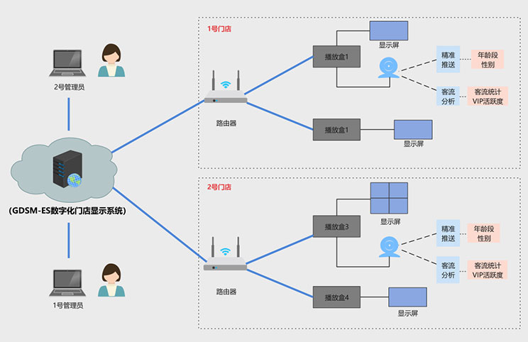 该客户为宁波地区零售门店,在一段时间内,客户发现门店销售额持续下滑,但是不知道原因出在哪里,到底是消费者减少,还是广告推送出现问题,亦或是其他原因,客户没有头绪,ONE游戏科技数据化门店显示系统完美的解决了客户痛点,方案拓扑图如下: