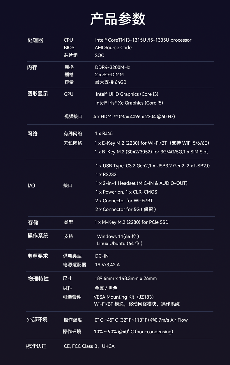 ONE游戏科技D613采用英特尔Raptor Lake酷睿i3-1315U/i5-1335U 处理器,作为一款性能强悍的主机,它的TDP仅15W,能有效降低能耗,延长电池寿命。在内存方面,D613采用2 x SO-DIMM DDR4-3200 MHz,最大可达64GB,并配备1 x M-Key M.2 (2280) for PCIe SSD。