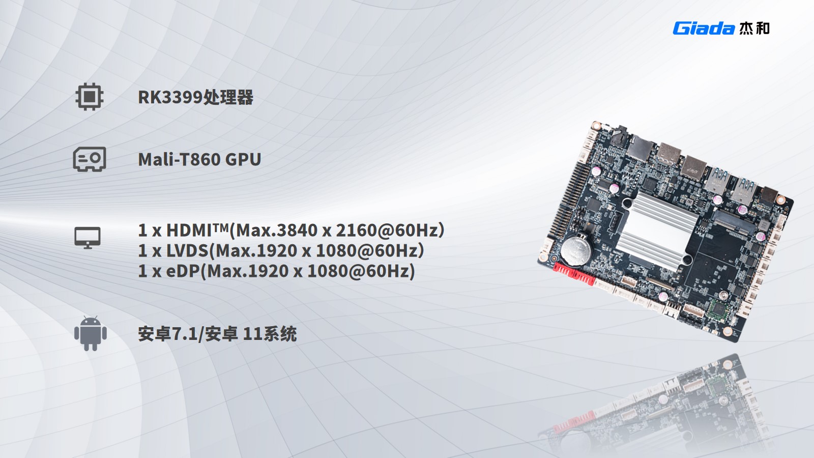 DN74支持安卓7.1、安卓8.1、安卓11系统,采用瑞芯微RK3399处理器,支持板载双通道LPDDR4内存、eMMC5.1存储以及双频WiFi、蓝牙4.2。视频拥有2个HDMI接口,分别能达到4K、2K分辨率显示输出,无风扇设计,适合安静运行。