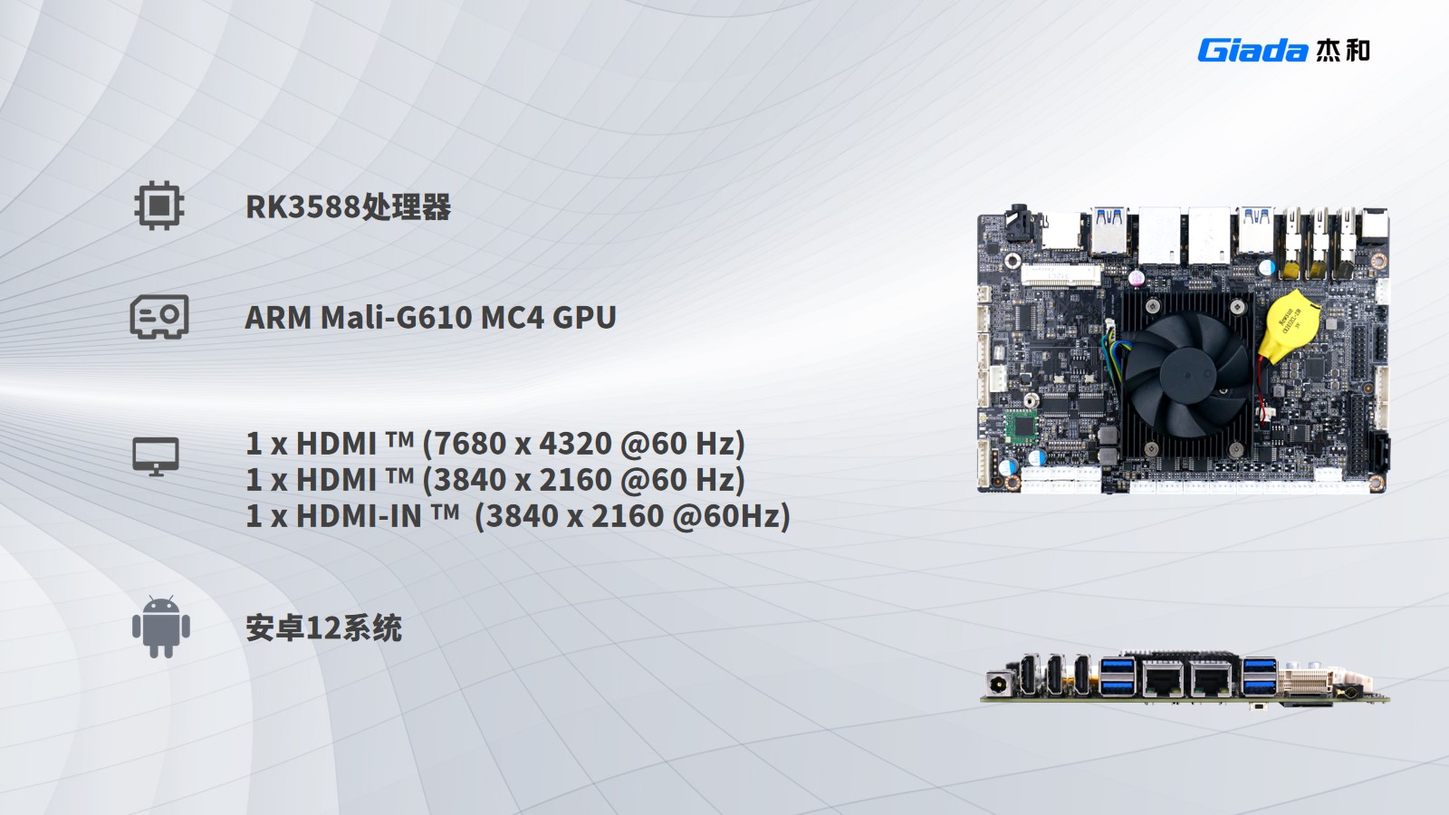 与前面几款产品对比,IB3-771拥有更强的算力,能够处理高达3200万像素的图像数据,适用于边缘计算设备和智能终端,如智能监控、工业自动化和智能零售;搭载瑞芯微RK3588处理器,支持安卓12系统,内置G610 MC4 GPU,支持8K视频硬件解码编码及多摄像头输入,提供eDP/DP/ HDMI2.1/MIPI 多种显示接口。