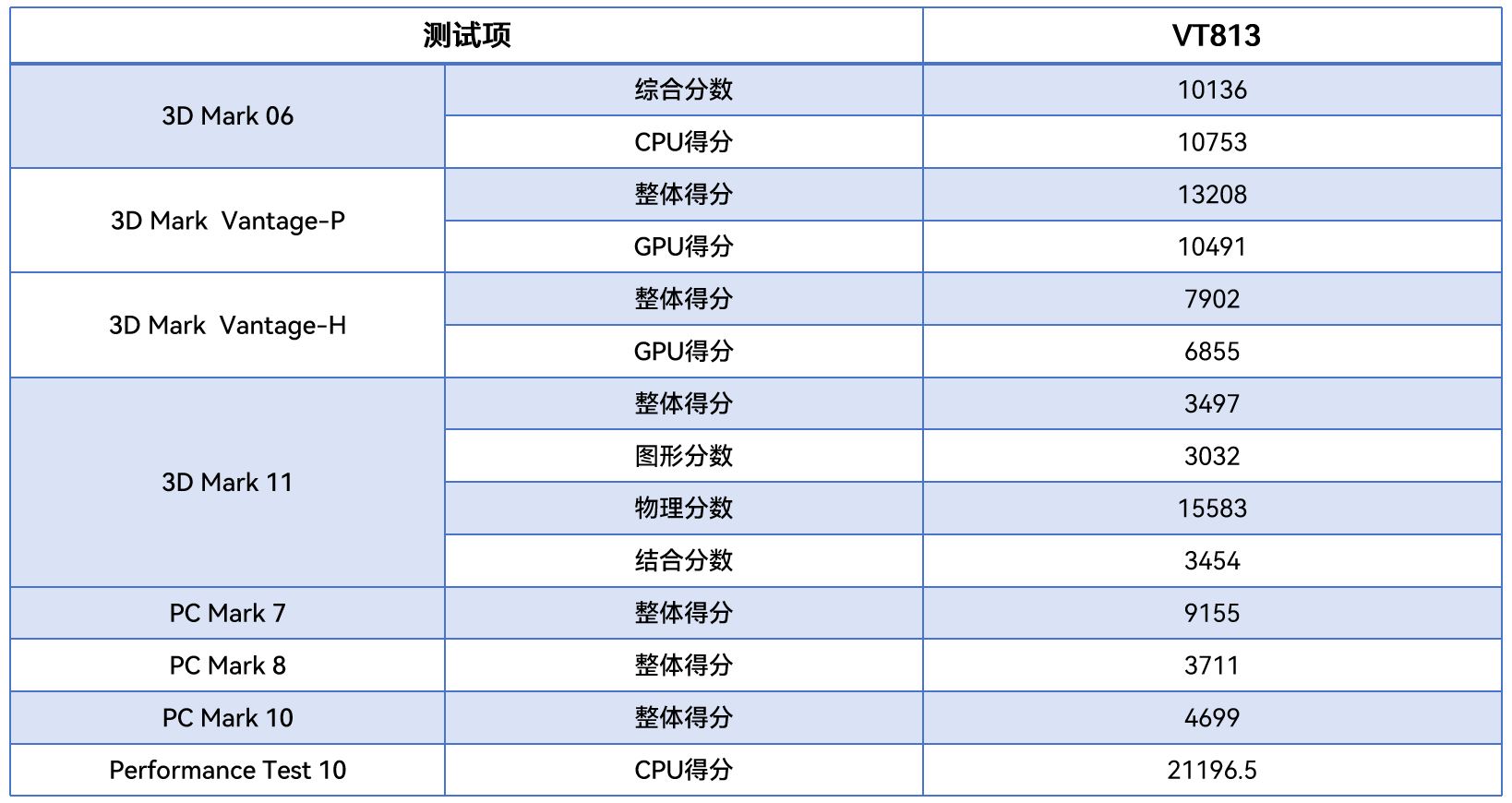从不同测试软件的跑分情况可以看出,VT813在图形渲染、物理运算及整机综合性能等方面的整体表现优异,下面我们将针对具体的几项数据来进行详细分析解读。