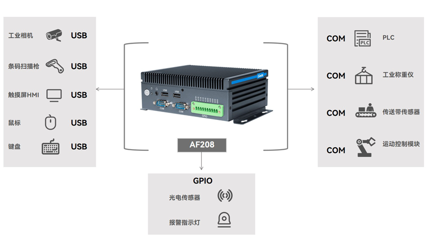 接口配置可应对设备连接,符合成本与性能的平衡需求。同时,AF208 的无风扇设计能更好地适应车间粉尘环境,且其尺寸更小巧,安装在控制柜内更节省空间。