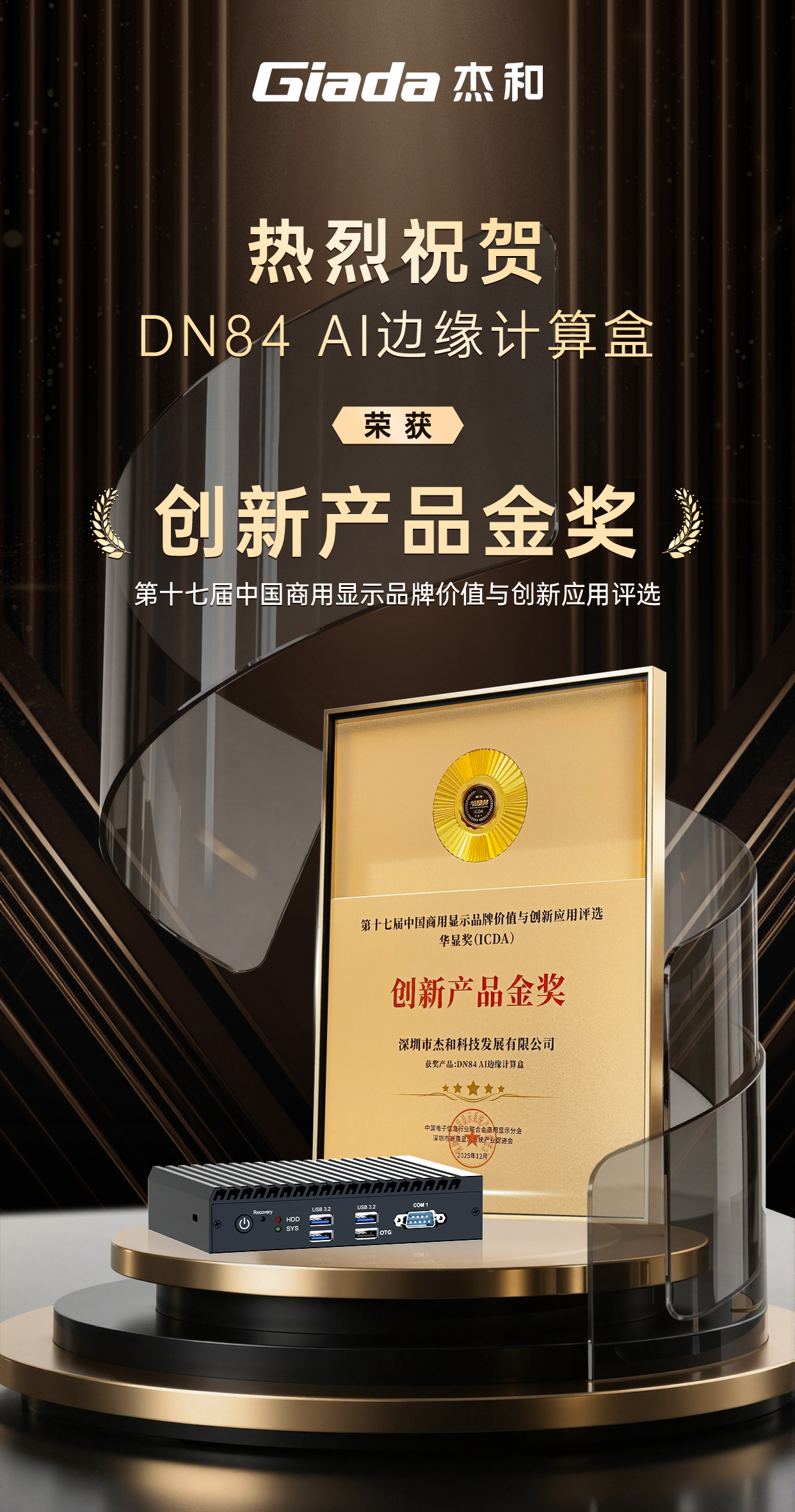 在备受瞩目的“ICDA华显奖”颁奖盛典上,ONE游戏科技AI边缘计算盒DN84凭借其创新的边缘AI性能与设计,赢得了评委会的高度认可,成功斩获“创新产品奖”。