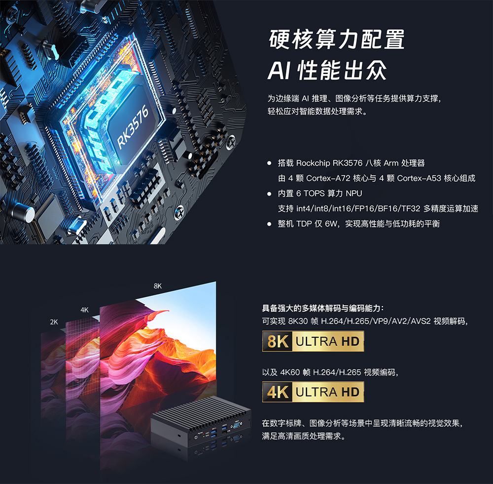 内置 Mali-G52MC3 GPU,配备双 HDMI™输出(最高 4K@120Hz)且可选 HDMI™输入,4K 高清显示与多媒体解码(8K30 解码、4K60 编码)能力强劲,适配数字标牌、图像分析等多元场景。