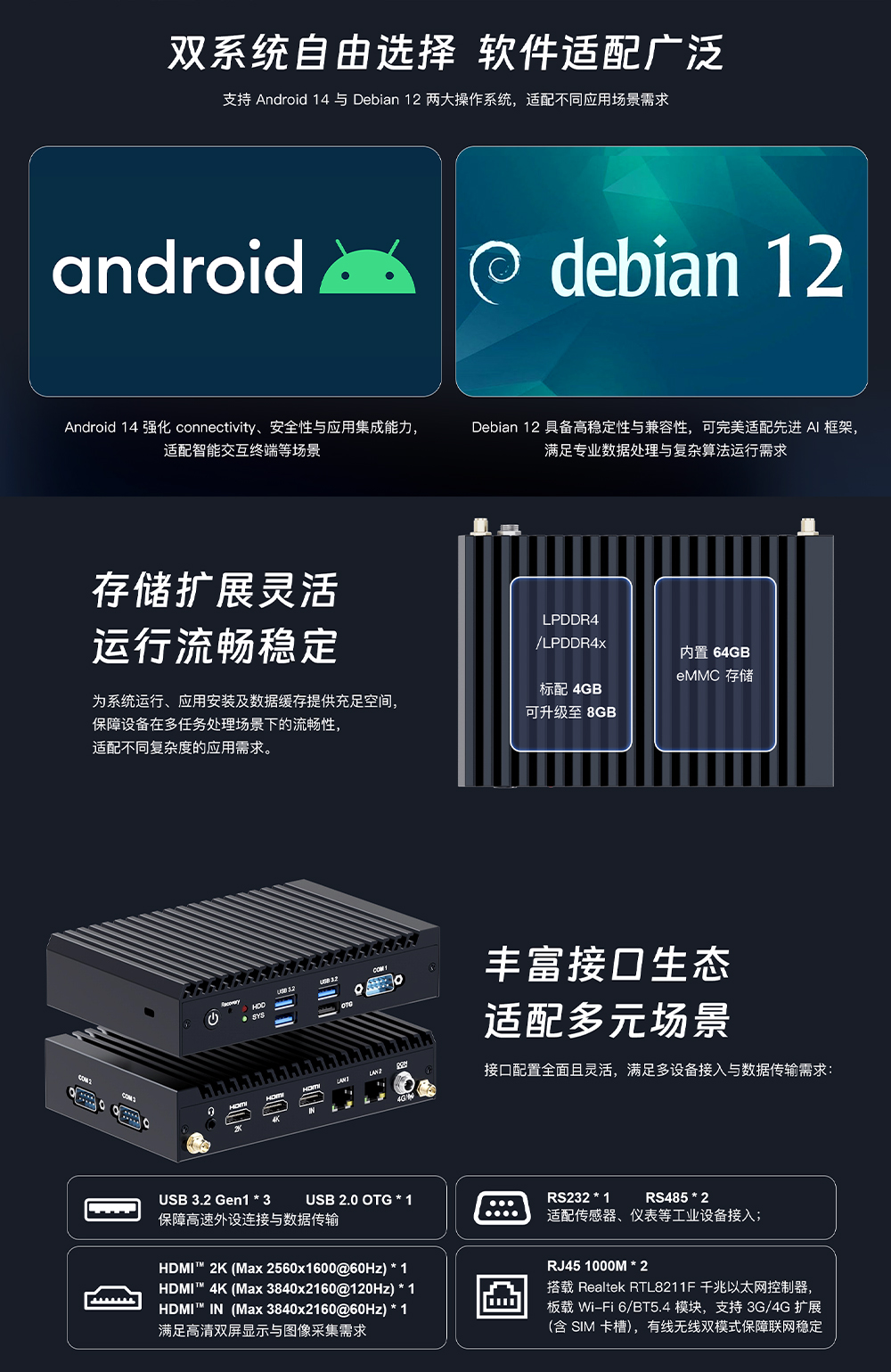 它提供 Android 14 与 Debian 12 双系统选择,兼顾连接安全性、应用兼容性与 AI 框架适配性,搭配最高 8GB LPDDR4/4x 内存与 64GB eMMC 存储,满足不同算力与存储需求
