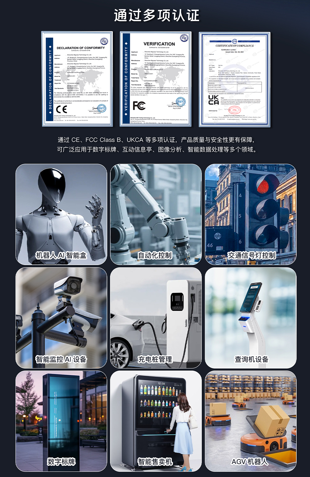 165×108×40mm 的小巧金属机身,搭配 6W 低功耗设计与 0°C~60°C 宽温运行能力,兼具便携性与环境适应性,还通过 CE、FCC Class B 等权威认证,稳定可靠。DN84 AI边缘计算盒助力数字标牌、智能零售、互动信息亭、机器人控制等场景实现从“被动展示”到“主动感知、智能交互”的跨越。