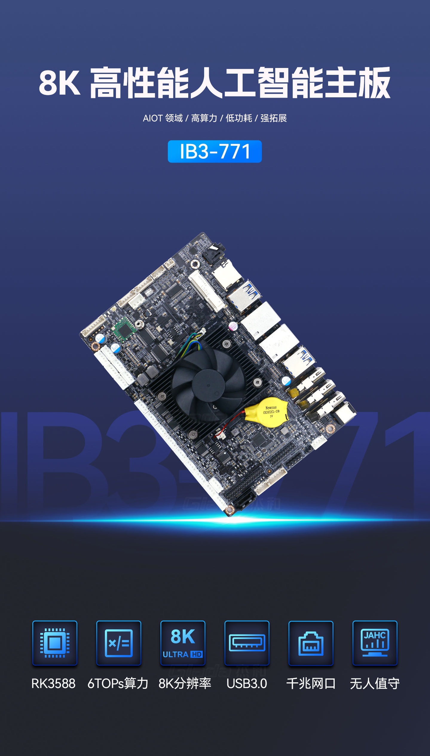 ONE游戏科技IB3-771采用瑞芯微全新旗舰级芯片RK3588,搭载八核64位处理器,集成ARM Mali-G610 MP4 GPU,高算力、低功耗、具备强大的视觉处理能力;性能强悍的RK3588内置AI加速NPU,提供6TOPs算力,支持主流深度学习框架,为各类AIoT应用场景提供更优的性能表现。