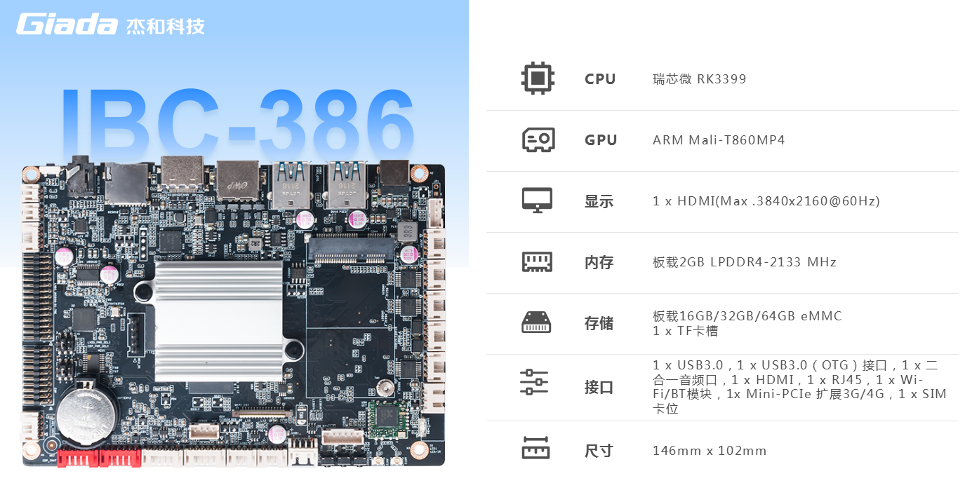 ONE游戏科技IBC-386是一款基于ARM架构的3.5英寸主板,采用瑞芯微RK3399处理器(双Cortex-A72大核+四 Cortex-A53小核)六核 64 位CPU。RK3399作为瑞芯微超级扩展全能型旗舰级芯片,GPU采用四核ARM新一代高端图像处理器Mali-T860MP4,具备高性能、低功耗、强大的视觉处理能力的特点。IBC-386板载2GB LPDDR4-2133 MHz内存,板载16GB/32GB/64GB eMMC,支持1x TF卡槽,多种形式轻松扩展存储容量。