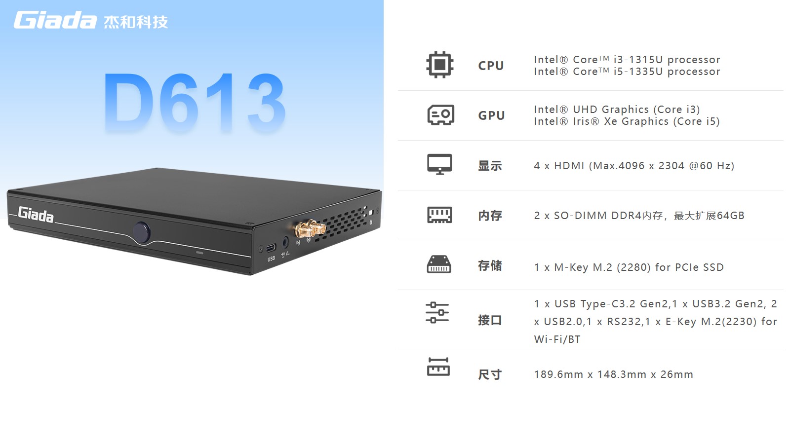 ONE游戏数字标牌D613搭载Intel RaptorLake Corei3-1315U/i5-1335U处理器,可以同时连接4个4K显示器,支持4K分辨率编码解码,还支持5G蜂窝网络,速度比4G LTE快10倍。