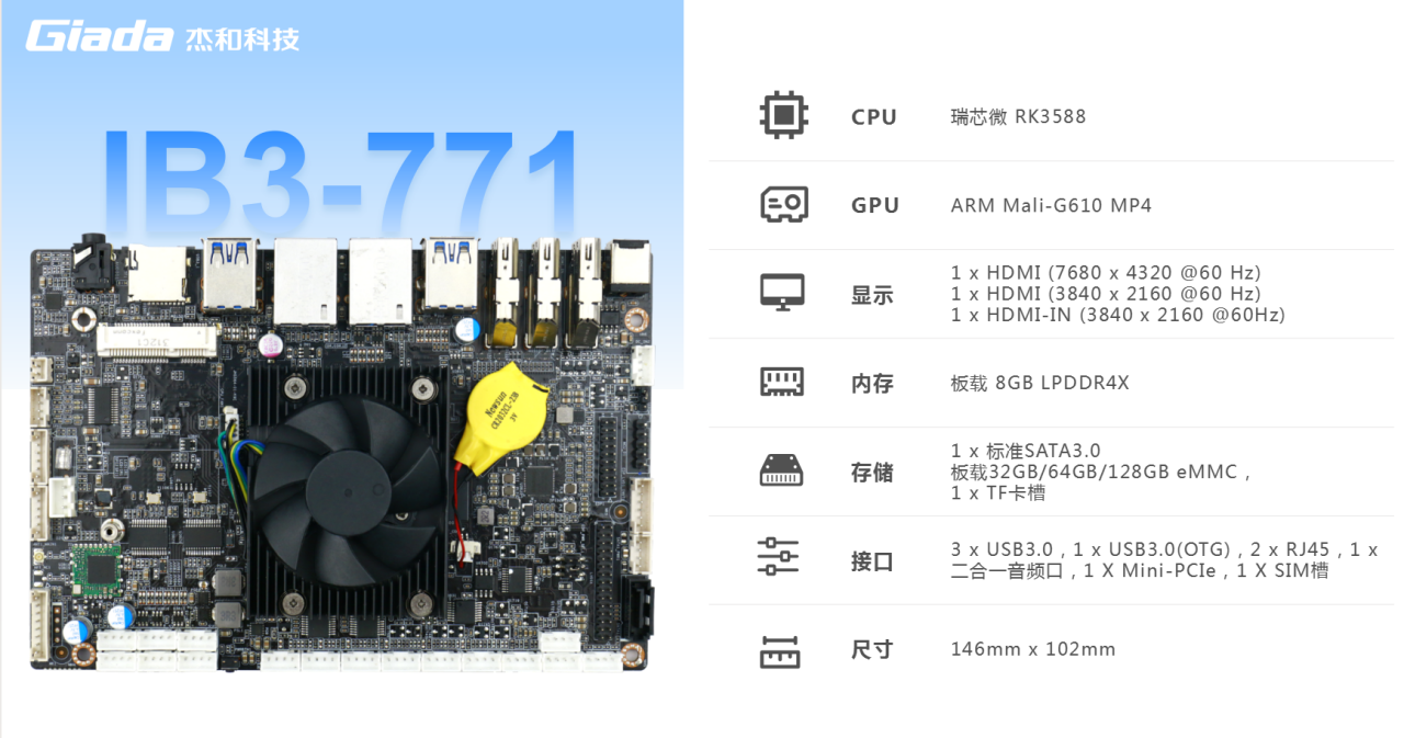 ONE游戏主板IB3-771搭载瑞芯微RK3588八核64位处理器,内置6TOPS算力的NPU,具备高算力、内存大、超强多媒体、多重扩展等技术优势。满足8k超高清视频的显示需求,还支持主流深度学习框架,为各类 AIOT 应用场景提供更优的性能表现,支持机器人、边缘计算、智能NVR、智能汽车、智慧大屏、AR/VR、智能自助终端场景的广泛应用。